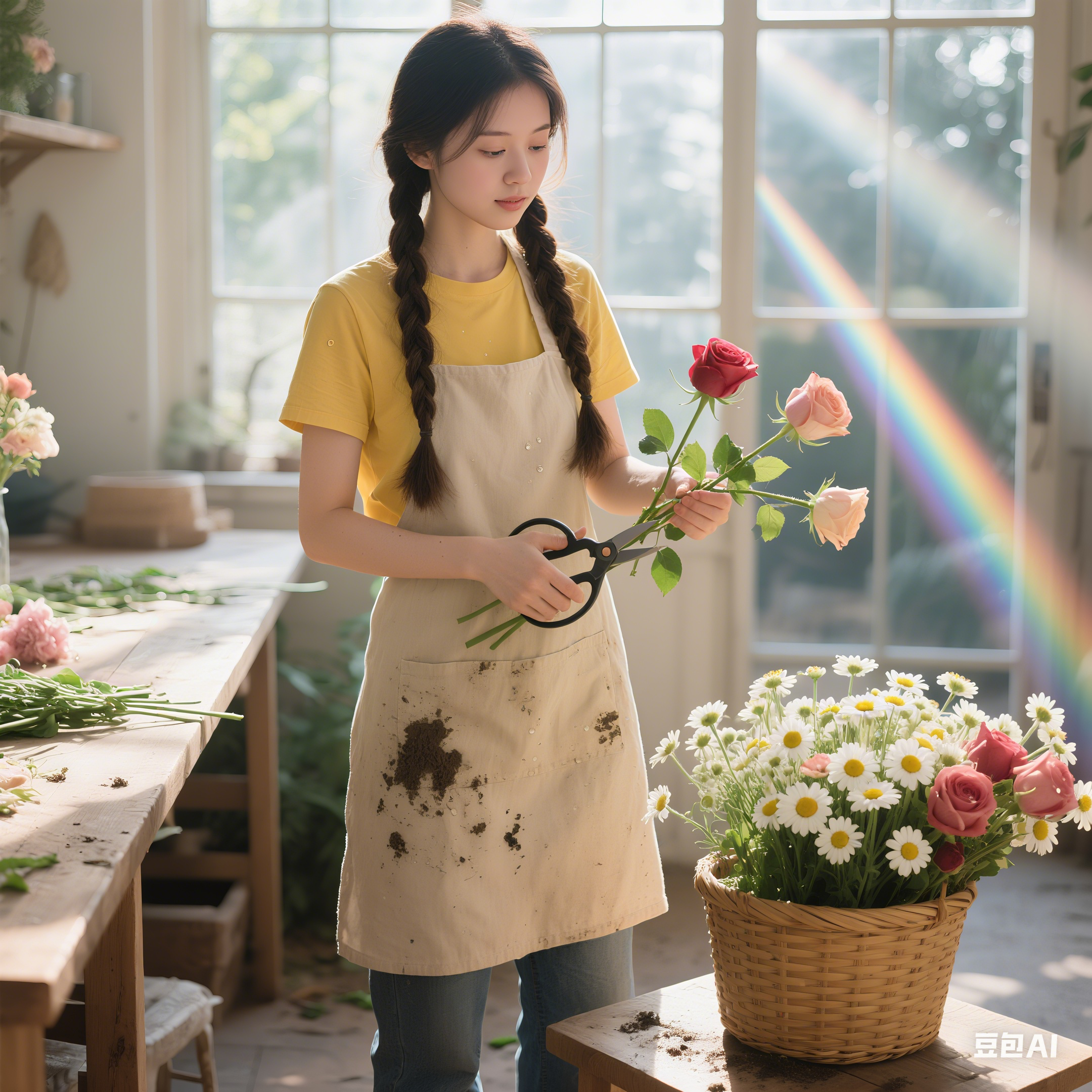 “20岁花艺师,麻花辫(长度及腰),米色亚麻围裙(沾有泥土痕迹),内搭鹅黄色棉质T恤。在木质工作台修剪玫瑰茎秆(剪刀距花茎45度角),脚边竹篮装满新鲜洋甘菊(约30朵)。上午10点的阳光透过玻璃门形成光束,花瓣上的水珠折射出彩虹光斑。”