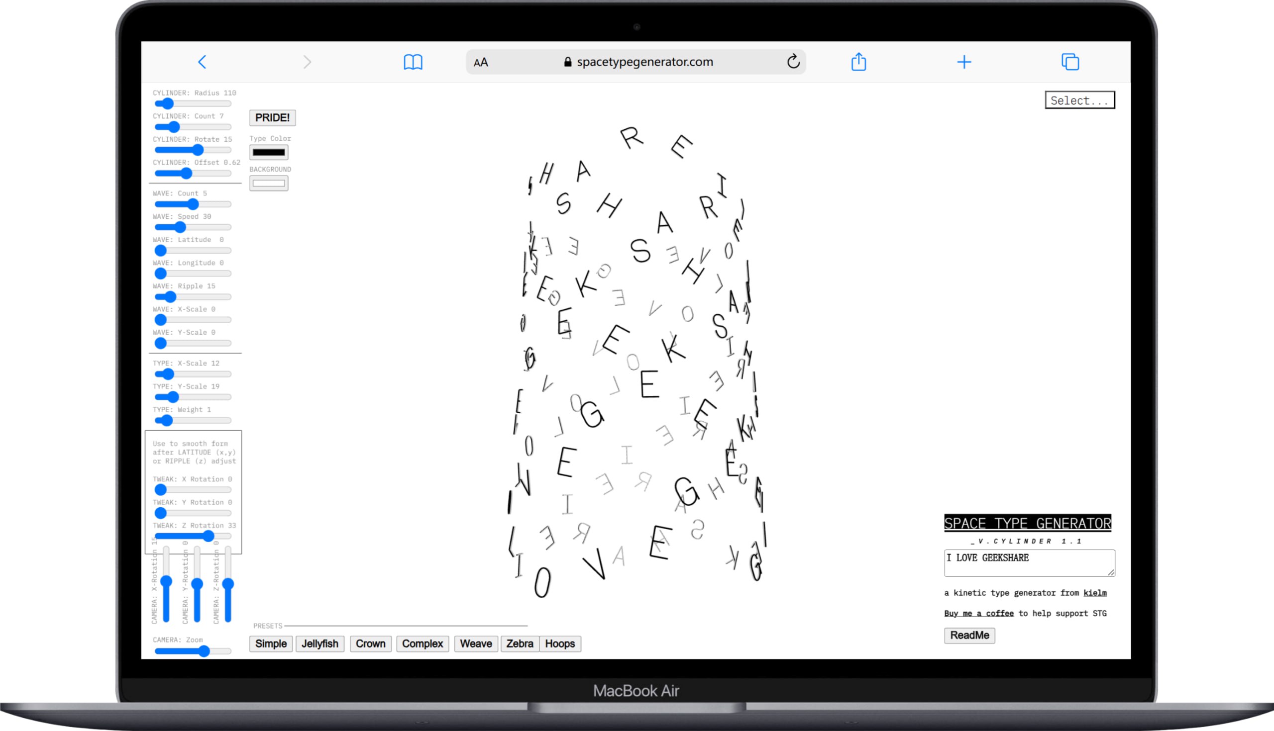 Space Type Generator:kielm 动态字体生成器 yunzhuanmi 2 月 05, 2025 254 0 #在线生成 #网站 #设计 空间类型生成器 (https://spacetypegenerator.com/) 网站可以生成千奇百怪的文字动画,充满科技感