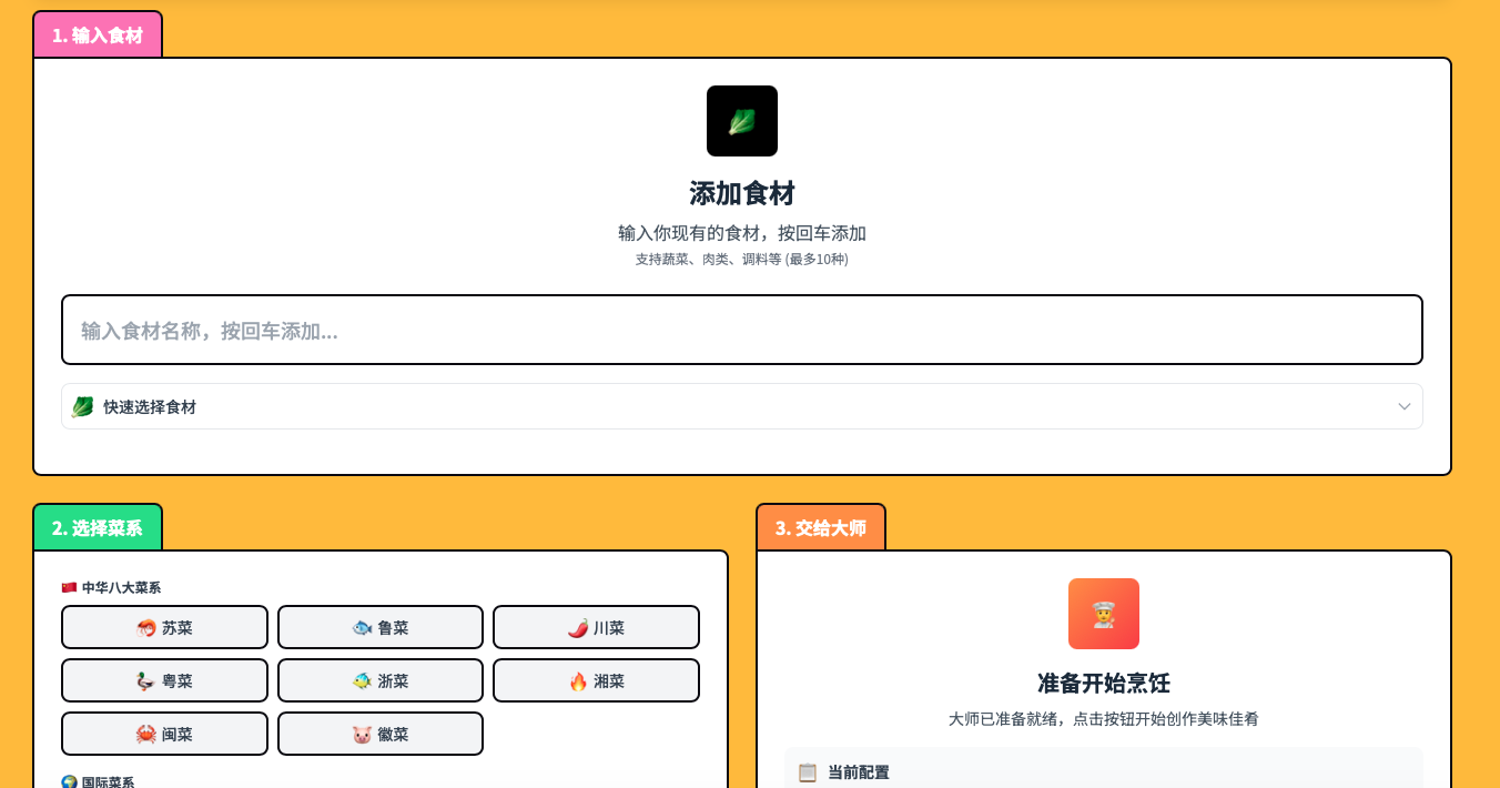 支持中华八大菜系 + 国际料理,提供营养分析、酒水推荐、菜谱效果图生成等全方位烹饪指导。